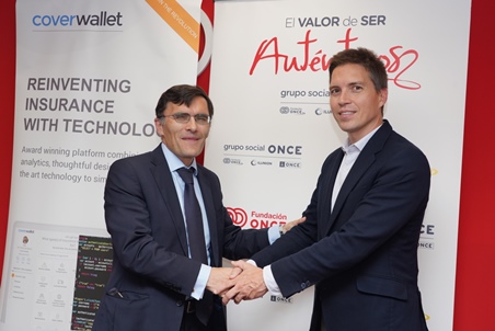 CoverWallet y Fundación ONCE han firmado en Madrid un convenio de colaboración por el que se comprometen a trabajar juntas en la mejora de la formación y el empleo de las personas con discapacidad, con acciones como la promoción de prácticas académicas por parte de universitarios con discapacidad en la empresa de contratación de seguros.