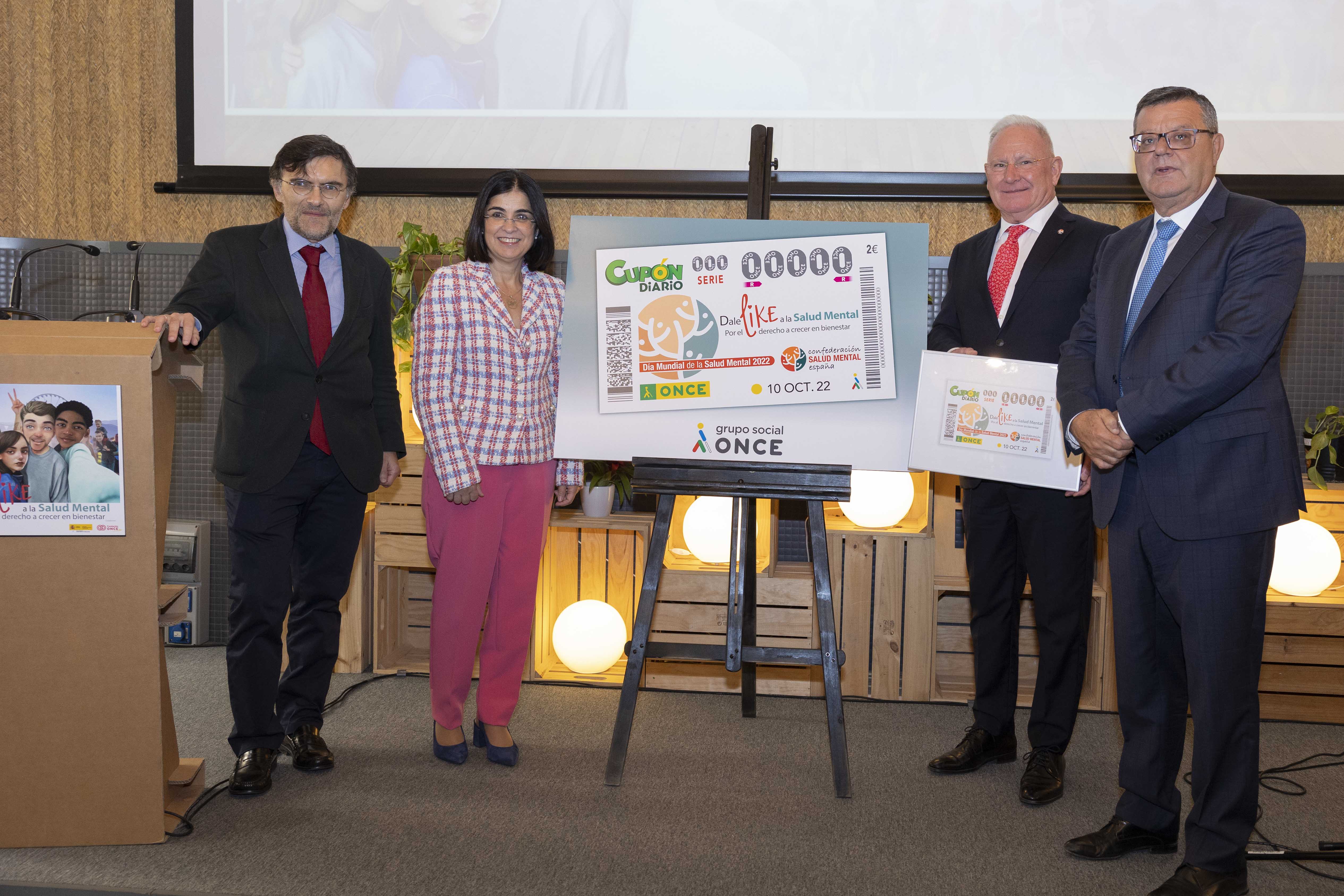 El cupón lo presentaron este miércoles en Madrid Carolina Darias, ministra de Sanidad, Consumo y Bienestar Social; Alberto Durán, vicepresidente ejecutivo de Fundación ONCE; José Luis Martínez Donoso, director general de Fundación ONCE, y Nel González, presidente de la Confederación SALUD MENTAL ESPAÑA. El cupón anima a dar un like a la Salud Mental, ‘Por el derecho a crecer en bienestar’.