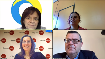 Este viernes se han reunido telemáticamente Ana Muñoz de Dios, directora general de la Fundación Integra; José Luis Martínez Donoso, director general de Fundación ONCE; Paola del Río, directora corporativa de Personas y Organización de ILUNION; Virginia Carcedo, secretaria general de Inserta Empleo y directora adjunta de Formación, Empleo y Transformación de Fundación ONCE, y Edelmira González, consultora de Inserta Empleo, quienes han puesto en valor el trabajo efectuado hasta la fecha y la importancia de continuar luchando conjuntamente contra esta lacra social, como es la violencia de genero.